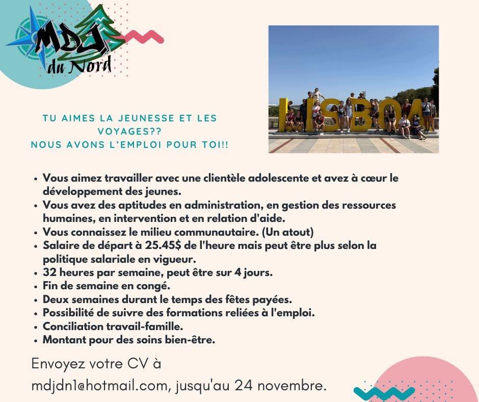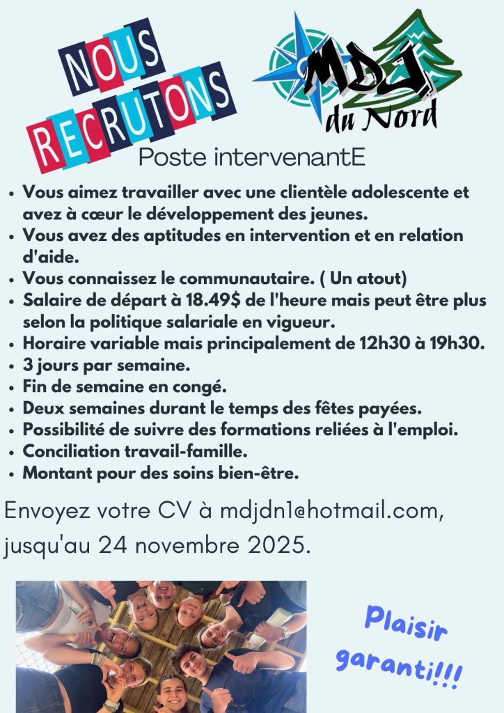 La Maison des Jeunes (MDJ) du Nord, c’est le repère de la jeunesse de Saint-Michel-des-Saints. Avec coeur et passion, l’équipe travaille à faire de la Maison des jeunes un milieu sain, ouvert et éducatif pour les adolescent(e)s. L’équipe est à se renouveler. Voici le détail des deux postes à combler. Ne manque pas ta chance de faire une différence !