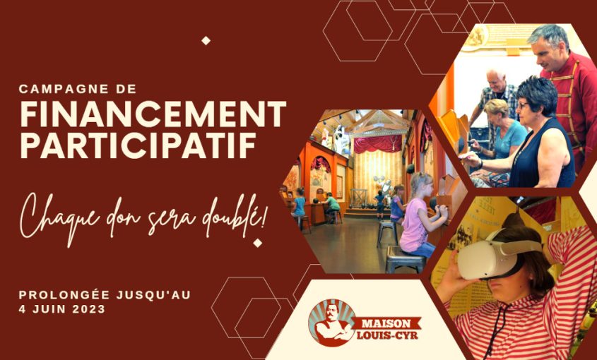 Les Compagnons de Louis Cyr annoncent la prolongation de la campagne de financement participatif. Cette campagne, qui se poursuivra jusqu’au 4 juin inclusivement, a pour objectif de soutenir le musée dans la bonification de sa programmation d’activités éducatives, culturelles et touristiques. Les fonds permettront, entre autres, de développer une toute nouvelle offre auprès des aînés.