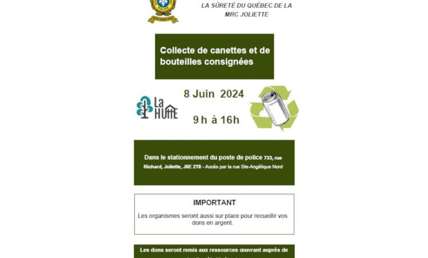 La Sûreté du Québec de la MRC de Joliette, en collaboration avec l’organisme La Hutte, tiendra samedi une collecte de cannettes et de bouteilles consignées. L’évènement se tiendra entre 9h et 16h dans le stationnement du poste de police situé sur la rue Richard. Les organismes seront aussi sur place pour recueillir vos dons en