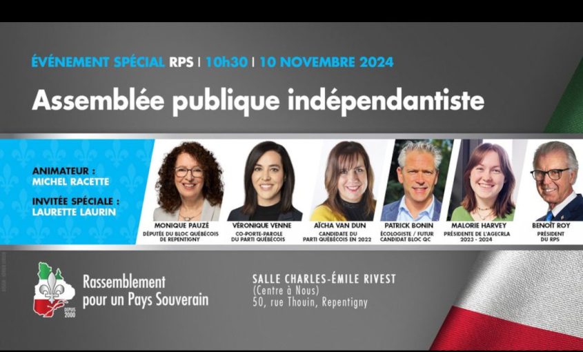 Le Rassemblement pour un Pays Souverain organise une assemblée publique indépendantiste, le dimanche 10 novembre, à 10 h 30, à la salle Charles-Émile Rivest du «Centre à nous», situé au 50, rue Thouin, à Repentigny. Elle se tiendra sous le thème abordé «Viens faire un pays». Parmi les invités : Monique Pauzé, députée du Bloc Québécois