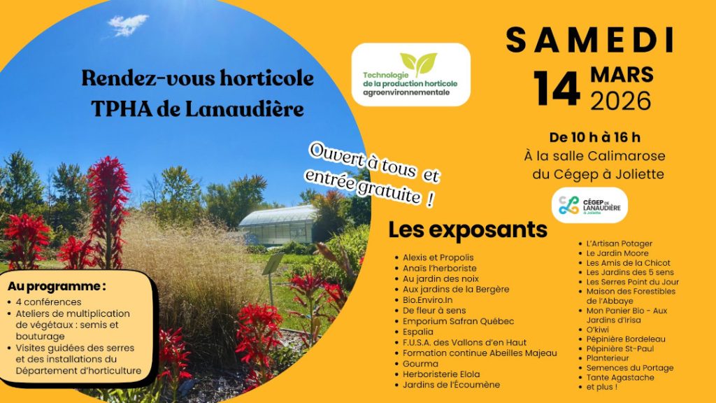 Le programme Technologie de la production horticole agroenvironnementale du Cégep de Lanaudière à Joliette tiendra une deuxième édition du Rendez-vous horticole TPHA de Lanaudière, le samedi 14 mars de 10h00 à 16h00.