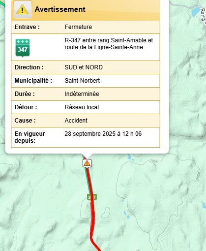 Un accident, dont la vitesse pourrait être la cause, a causé la fermeture du Chemin du Lac à Saint-Norbert durant plusieurs heures dimanche, en début d’après-midi. Selon TVA Nouvelles, un premier véhicule aurait mal négocié une courbe sur le chemin du Lac et aurait empiété sur la voie opposée. Le conducteur n’aurait pas été en
