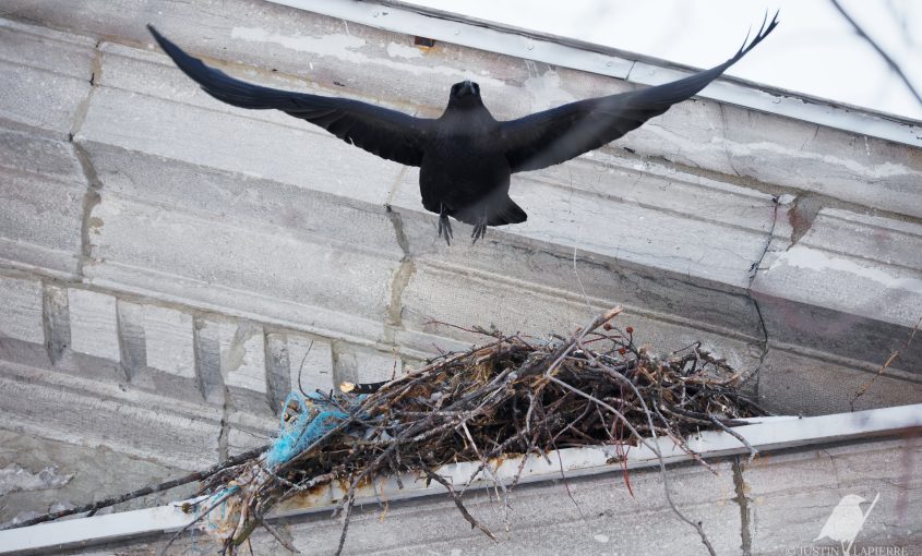 Pour écouter, cliquez ici. Photo : Grand Corbeau au nid (église de Saint-Thomas), février 2026