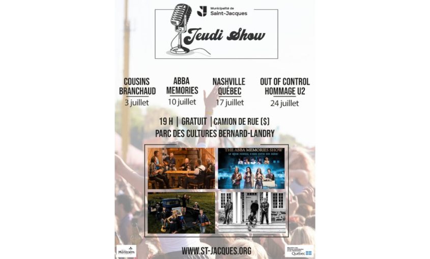 La municipalité de Saint-Jacques annonce le retour des Jeudi Show, une série de spectacles gratuits en plein air, qui en sera à une 4e édition. Tout au long de l’été, petits et grands sont conviés à venir profiter de 4 spectacles gratuits, présentés les jeudis soir, dans une ambiance conviviale et familiale. Musique, performances artistiques