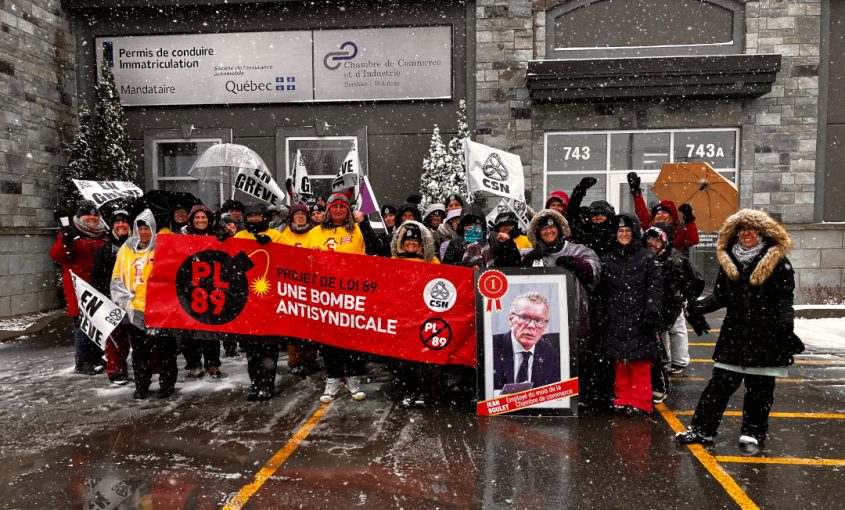 Plusieurs syndiqués affiliés a la CSN ont manifesté mardi devant la Chambre de Commerce du Grand Joliette puis devant la Chambre de Commerce et d’Industrie Berthier-D’Autray afin de rappeler au gouvernement et au ministre du Travail, Jean Boulet, que le projet de loi 89 doit être retiré. Selon les syndiqués, le projet de loi est