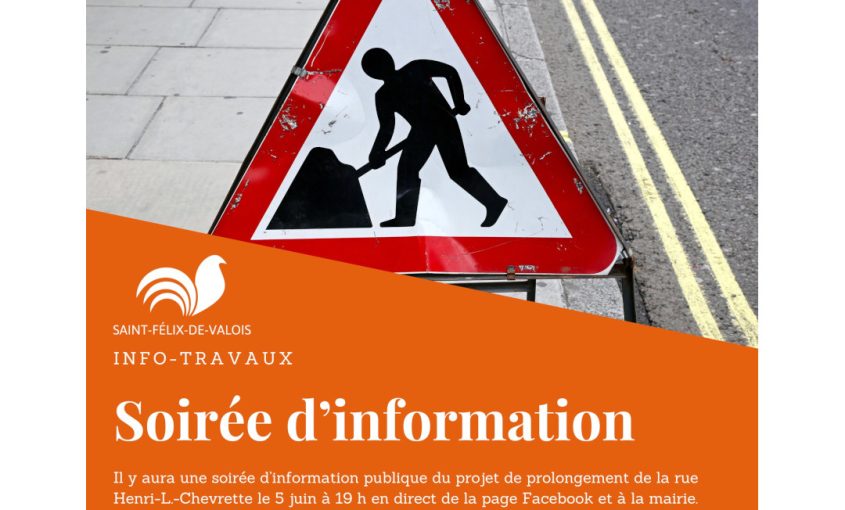 Les autorités de Saint-Félix-de-Valois tiendront une soirée d’information publique le 5 juin 19 h au sujet du projet de prolongement de la rue Henri-L.-Chevrette. La rencontre, qui aura lieu à la Salle du Conseil de Ville, s’adresse aux résidents du secteur touchés par les travaux ainsi que par le réaménagement de l’intersection de l’avenue Poirier