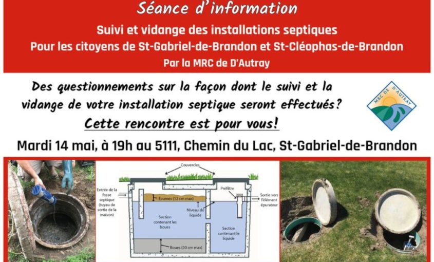 La MRC de D’Autray tiendra une séance d’information concernant la prise en charge, depuis le 1er janvier, du programme de vidange des installations septiques des municipalités de Saint-Gabriel-de-Brandon et Sainte Cléophas-de-Brandon. Cette rencontre se tiendra le 14 mai à compter de 19h, à la mairie. À partir de ce printemps, un programme de mesurage des