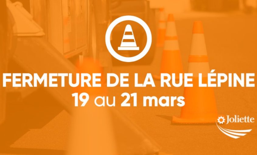 La ville de Joliette annonce que la rue Lépine, entre les rues P.-H.-Desrosiers et Perrault, sera fermée d’aujourd’hui au 21 mars, afin de procéder à la construction d’un nouveau raccord d’aqueduc et d’égout. Ces travaux se dérouleront de jour. Un chemin de détour sera mis en place via les rues Piette et De Lorimier. La