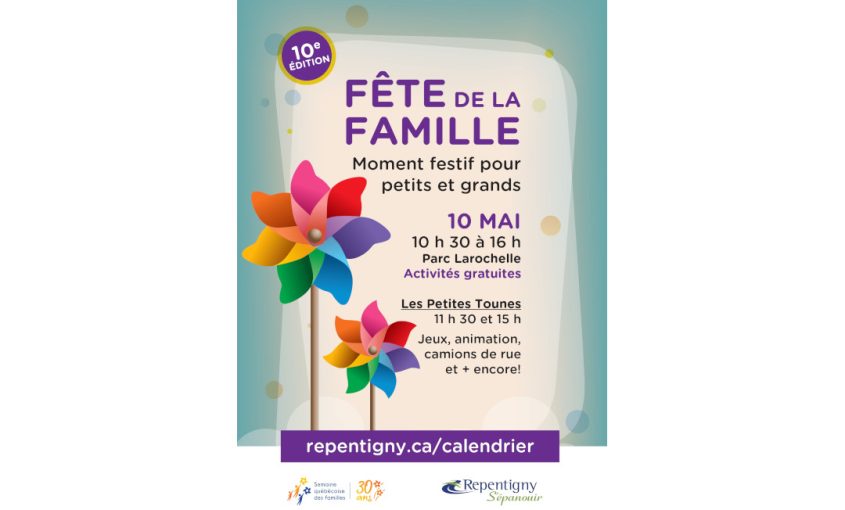 Dans le cadre de la Semaine québécoise des familles, la Ville de Repentigny avec différents organismes partenaires tiendra le 10 mai, la 10e édition de la Fête de la famille, au parc Larochelle. Une multitude d’activités seront offertes gratuitement. Pour connaître tous les détails, consulter le site Web au repentigny.ca.