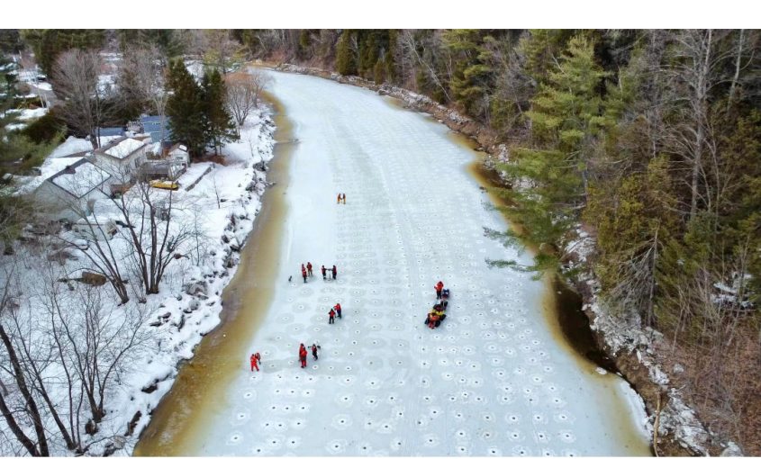Hydro Météo a réalisé plus de 15 000 forages dans le chenal principal de la rivière L’Assomption pour affaiblir son couvert de glace et maximiser son érosion. Ces travaux permettront de prévenir la rupture subite de la couche de glace ou encore l’obstruction du cours d’eau par un amas de glace flottante. Bien que ces travaux