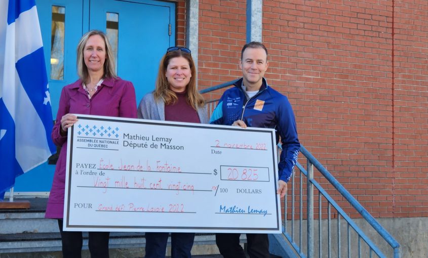 Dans le cadre de sa participation au Grand Défi Pierre Lavoie, Mathieu Lemay a remis 20 825$, le 2 novembre, à l’école Jean-de la Fontaine. En tant que parrain de l’établissement, il devait encourager la pratique d’activités physiques et promouvoir de saines habitudes de vie auprès des étudiants. M. Lemay a amassé plusieurs dons dans