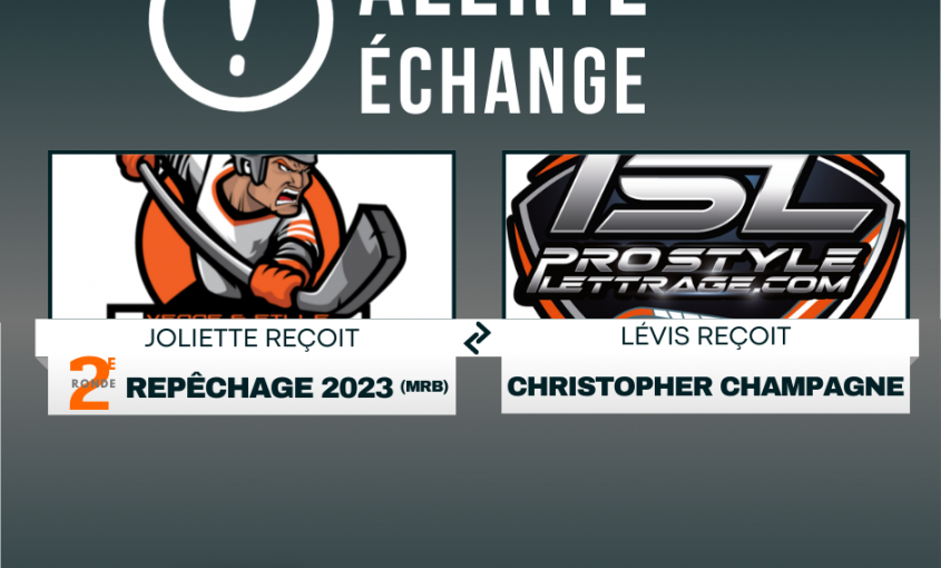 L’Assurancia Venne et fille de Joliette dans la Ligue Nationale de Hockey Balle envoie le joueur U23, Christopher Champagne au Prostyle Lettrage de Lévis. En retour Joliette obtient un choix de 2e ronde au prochain repêchage. Champagne n’a participé qu’à seulement 5 matchs cette saison. Il n’avait amassé aucun point lors de ces rencontres. À