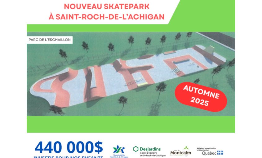 Le conseil municipal de Saint-Roch-de-l’Achigan vote à l’unanimité l’octroi d’un contrat pour la construction d’un nouveau skatepark, dont les travaux se dérouleront à l’automne 2025. Le projet, d’une valeur de 439 204,50 $, est inscrit au plan triennal des immobilisations de la municipalité. Le skatepark sera aménagé au parc de l’Eschaillon par l’entreprise Papillon Skatepark Inc.,