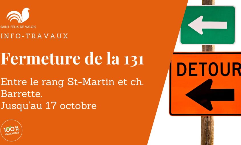 La route 131 restera fermée ce week-end entre la jonction des chemins de Joliette et Barette et le rang Saint-Martin à Saint-Félix-de-Valois pour des travaux de remplacement de ponceaux et le déplacement d’une conduite de gaz. Les détours se feront par le chemin Barette et la route 345. La circulation locale sera permise de part et d’autre