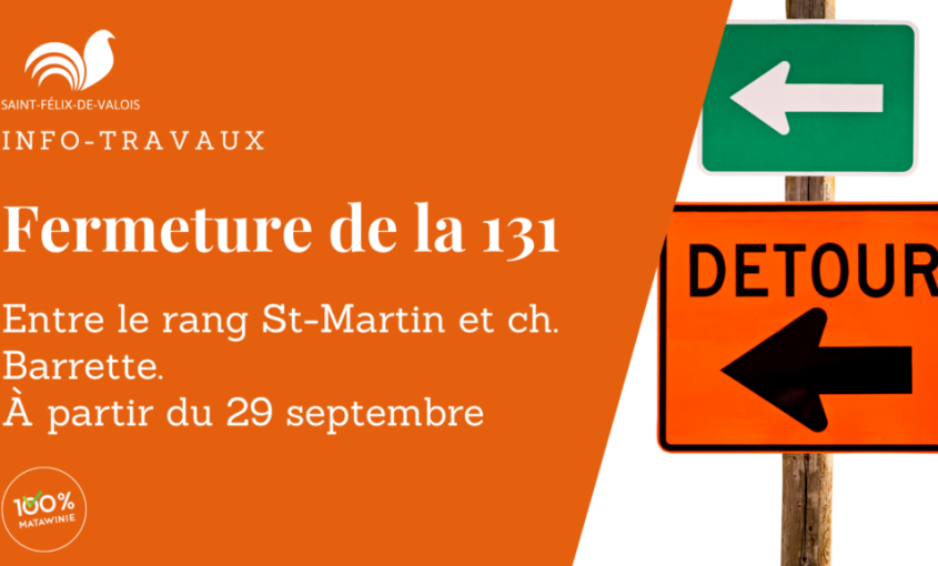 Le ministère des Transports et de la Mobilité durable entamera à compter de lundi des travaux de réfection de la route131 à Saint-Félix-de-Valois. Ces travaux, qui se poursuivront jusqu’à la mi-novembre consistent à remplacer quatre ponceaux ainsi qu’à effectuer le planage et l’asphaltage de la chaussée. Ilsauront lieu entre la jonction des chemins de Joliette,