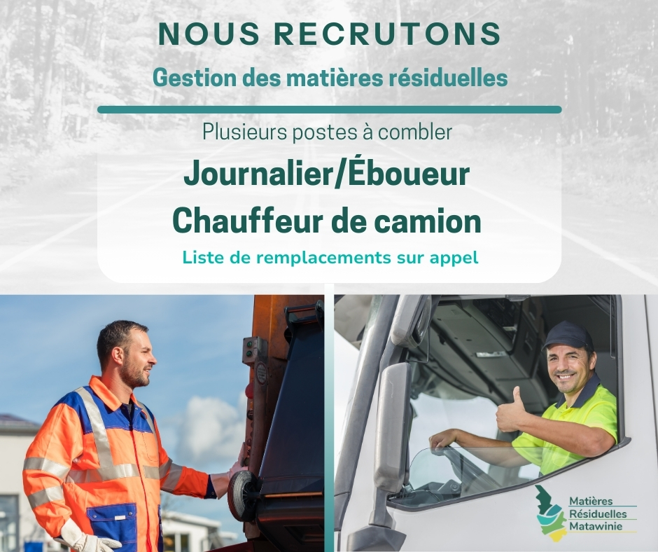 La MRC de Matawinie veut remplir sa banque de personnel sur appel aux postes de chauffeur(se) et éboueur(se) journalier(ère). C’est au sein de Matières résiduelles Matawinie que les intéressé(e)s pourront évoluer, soit avec un horaire flexible et dans des paysages magnifiques ! Ça t’interpelle ? Passe par ici : https://mrcmatawinie.org/carriere.