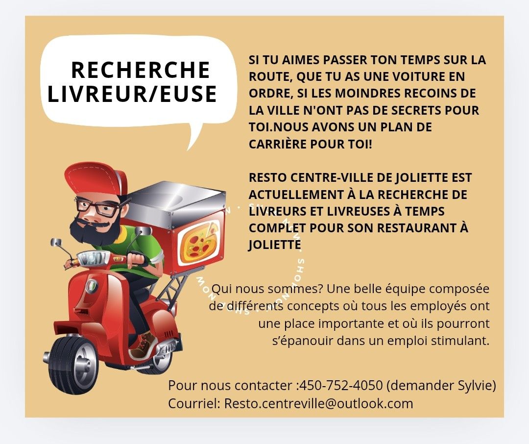 Véritable institution joliettaine, le Resto Centre-Ville est présent au coeur de la ville depuis belle lurette. Des postes à la livraison, à temps plein, sont actuellement à combler. Votre candidature est la bienvenue. Passez par [email protected] pour envoyer vos documents à l’attention de Sylvie !
