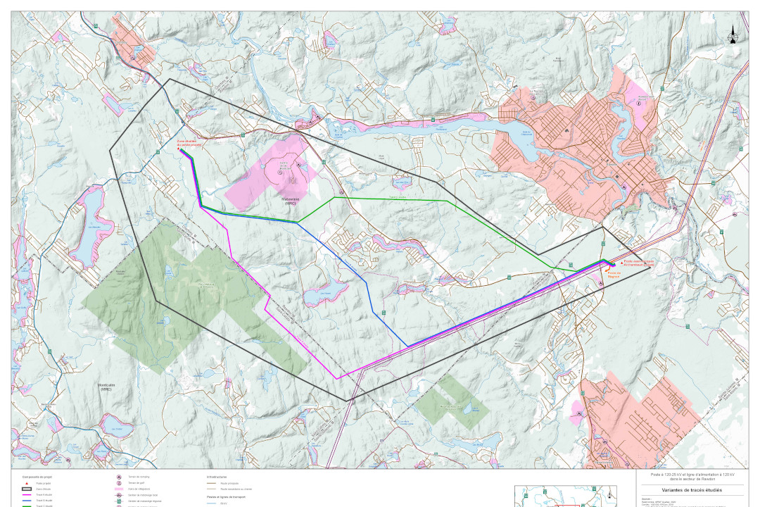 Les tracés varient de 15 km à 17km. Un des tracés impacte les milieux humide, un deuxième est près du milieu bâti et le troisième est plus éloigné des zones résidentielles. Les trois tracés aboutissent à l’emplacement privilégié pour un poste à Rawdon à l’intersection des routes 125 et 335.