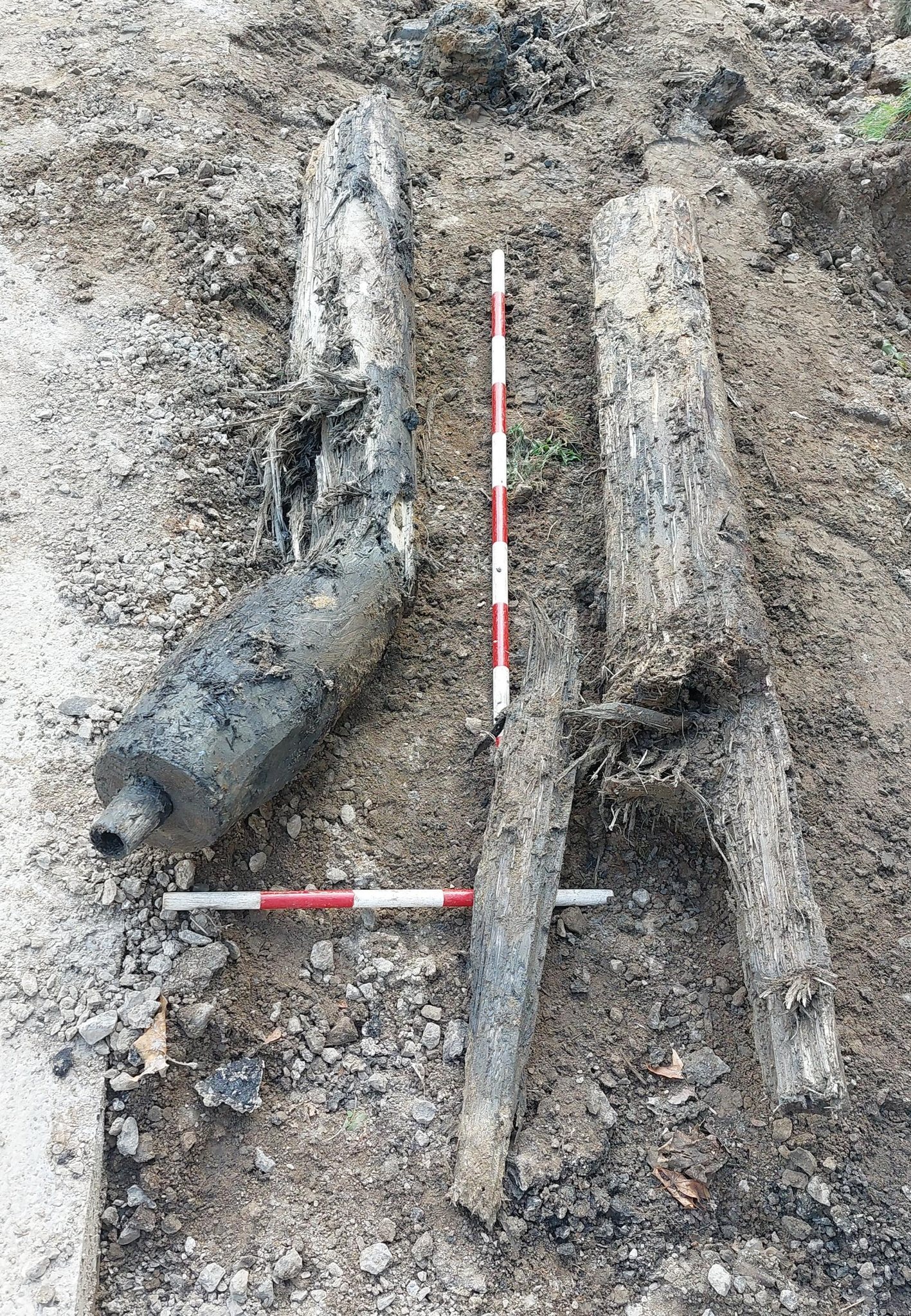 Sur la photo : Des segments de l’ancien réseau d’aqueduc en bois découverts sous la rue Sainte-Marie.