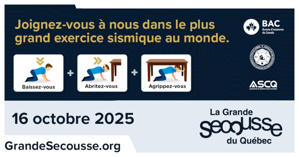 Cet exercice de préparation aux séismes rassemblera des milliers de participants partout au Québec afin de pratiquer des gestes simples, mais essentiels, qui peuvent sauver des vies et renforcer la sécurité de chacun.
