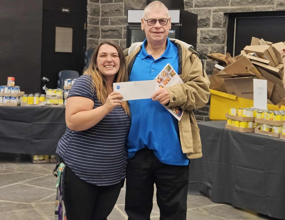 La photo nous montre le vice-président de la Société St-Vincent de Paul, Mario Vadnais accompagné de l’initiatrice du projet, Mégane Bourdon.
