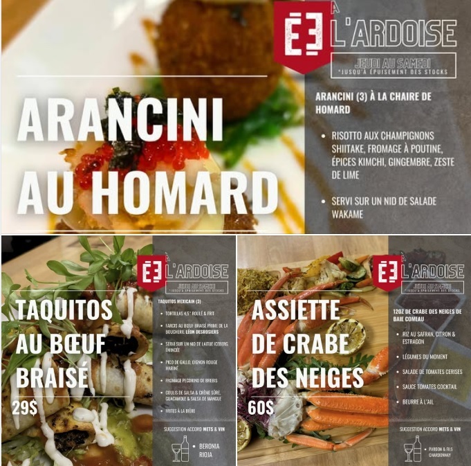 L’ardoise de la semaine à L’Échappée avec Maude H. : arancini au homard, taquitots au boeuf braisé et assiette de crabe. ⬇
