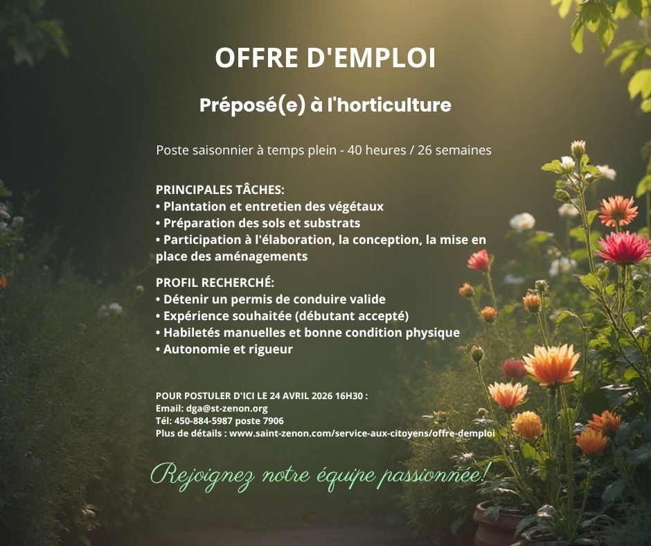 Offre d’emploi : préposé(e) à l’horticulture à Saint-Zénon