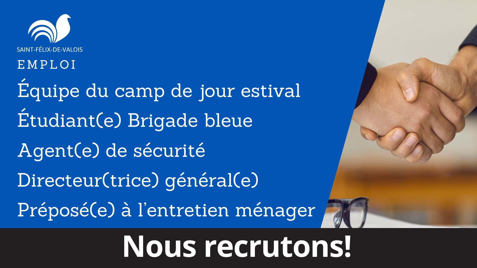 La municipalité matawinienne de Saint-Félix-de-Valois est à la recherche de plusieurs talents pour se greffer à son équipe. Tous les postes affichés ont des particularités qui en font des postes de rêve ! Pour consulter la liste des emplois offerts et leurs conditions, rendez-vous ici.