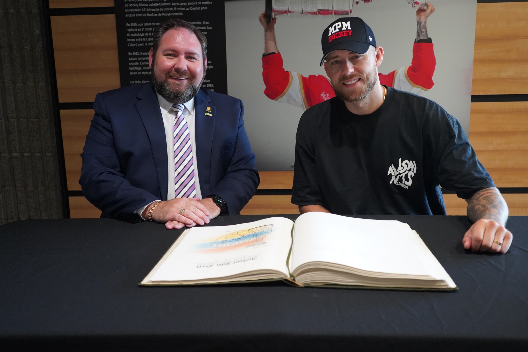 Comme le joueur de hockey A.J. Greer, vainqueur de la Coupe Stanley, est de passage à Joliette dans le cadre de son camp de hockey jeunesse, le maire, Pierre-Luc Bellerose, en a profité pour lui faire signer le livre d’or de la Ville.